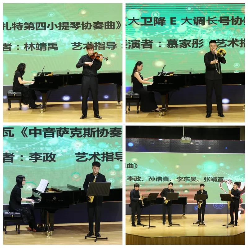 弦乐组一等奖获得者林靖禹演奏了《莫扎特第四小提琴协奏曲》第一乐章;铜管打击乐组一等奖获得者慕家彤演奏了《大卫降E大调长号协奏曲》第一乐章;木管组一等奖获得者李政演奏了杜博斯《中音萨克斯协奏曲》第三乐章;重奏组一等奖获得者李政、孙浩真、李东昊、张靖宣演奏了《希腊组曲》。音乐会现场气氛热烈,获奖学生演奏获得了观众的热烈掌声。