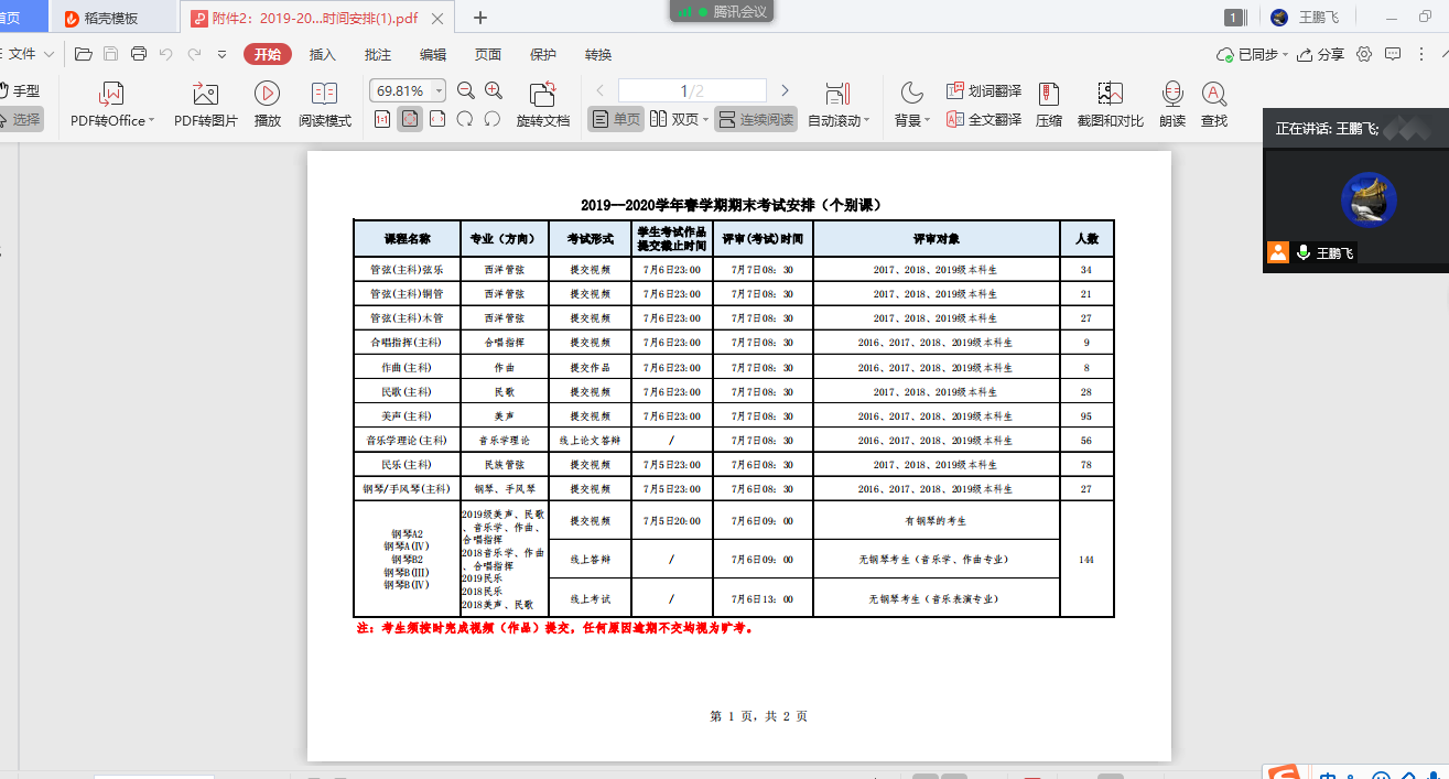 为进一步严肃考风考纪、保障本学期线上期末考试顺利进行,保证学生在疫情期间的假期安全,7月3日,管弦党总支通过腾讯会议召开线上考风考纪教育暨假期安全教育大会。管弦党总支副书记杨玲出席会议,会议由辅导员王鹏飞主持,管弦系全体本科生、研究生参加会议。