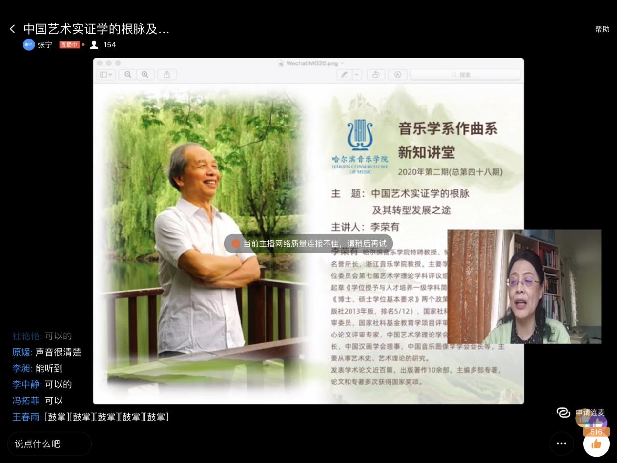 日前,威尼斯官网特聘教授、博导、艺术学研究所名誉所长,浙江音乐学院教授李荣有做客音乐学系作曲系第四十八期新知讲堂,并以《中国艺术实证学的根脉及其转型发展之途》为题作了讲座。讲座由艺术学研究所所长马卫星教授主持,音乐学系作曲系全体教师及本、硕、博学生参加。