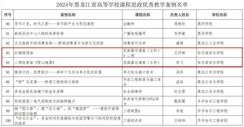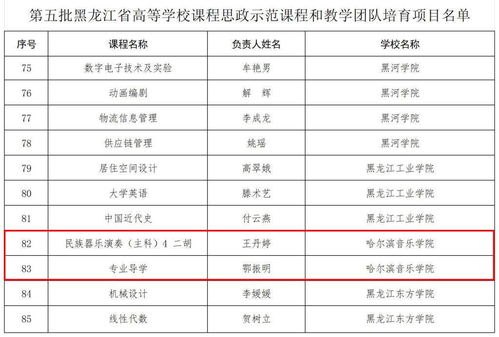 近日,省教育厅发布了《关于黑龙江省高等学校第五批课程思政示范课程和教学团队培育项目、2024年课程思政优秀教学案例名单的公示》,学院院长宋飞教授申报的《二胡协奏曲〈雪山魂塑〉》和民乐系副教授王丹婷申报的《红梅随想曲》两个案例荣获课程思政优秀案例。学院民乐系副教授王丹婷申报的《民族器乐演奏(主科)4》和声乐歌剧系副教授鄂振明申报的《专业导学》两门课程荣获课程思政示范课程和教学团队培育项目。