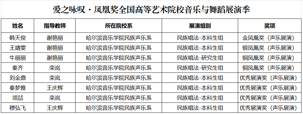 首届爱之咏叹·凤凰奖全国高等艺术院校音乐与舞蹈展演季中,韩天俊再添佳绩,获声乐展演金凤凰奖,本科生王靖雯获银凤凰奖,研究生牛丽丽、秦齐获铜凤凰奖,另有四名学子获优秀展演奖。同时,民族声乐系博导谢艳丽教授、栾岚教授、周虹池教授获优秀指导教师奖。