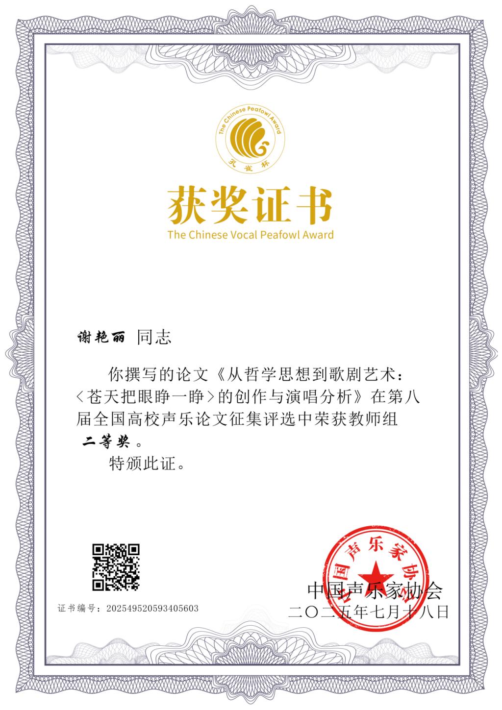 谢艳丽教授在2025年“孔雀杯”第八届全国高校声乐论文征集评选中荣获教师组二等奖,进一步彰显了民族声乐系声乐教学与科研水平的综合实力。