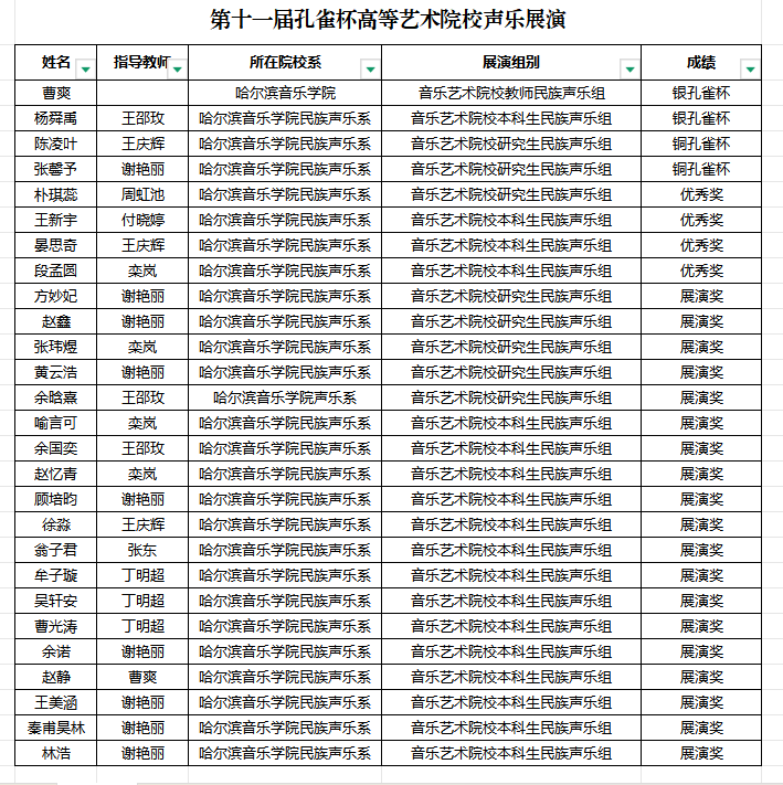 第十一届孔雀杯高等艺术院校声乐展演中,青年教师曹爽在音乐艺术院校教师民族声乐组斩获银孔雀杯。本科生杨舜禹荣获银孔雀杯,研究生陈凌叶、张馨予携手摘得铜孔雀杯,另有23名本、硕学子分获该赛事优秀奖与展演奖。