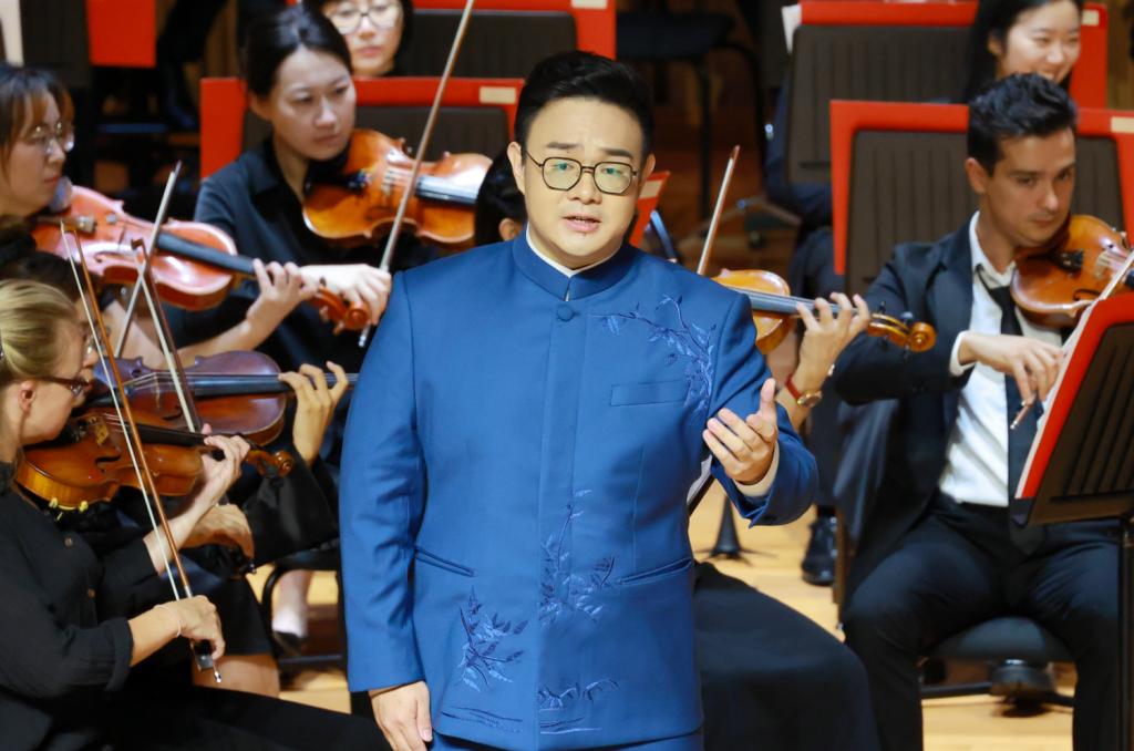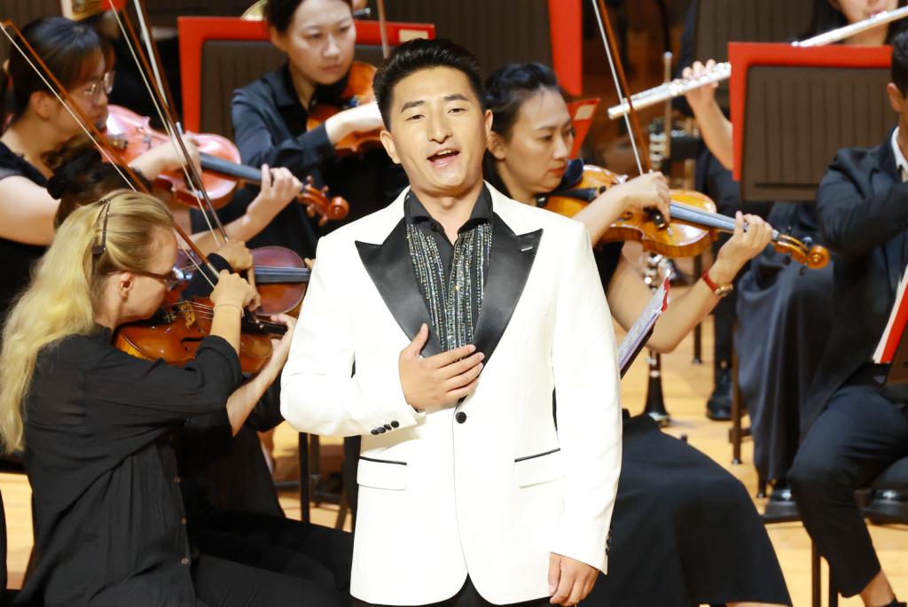 科研助理刘碧玥演奏的古筝与乐队《望秦川》气象开阔、技艺精湛,勾勒出壮美的音乐画卷;民族声乐系博士研究生郁留成献唱地方民歌《大河涨水沙浪沙》《挑茶郎从门前过》,生动质朴,尽显民歌风采韵味。