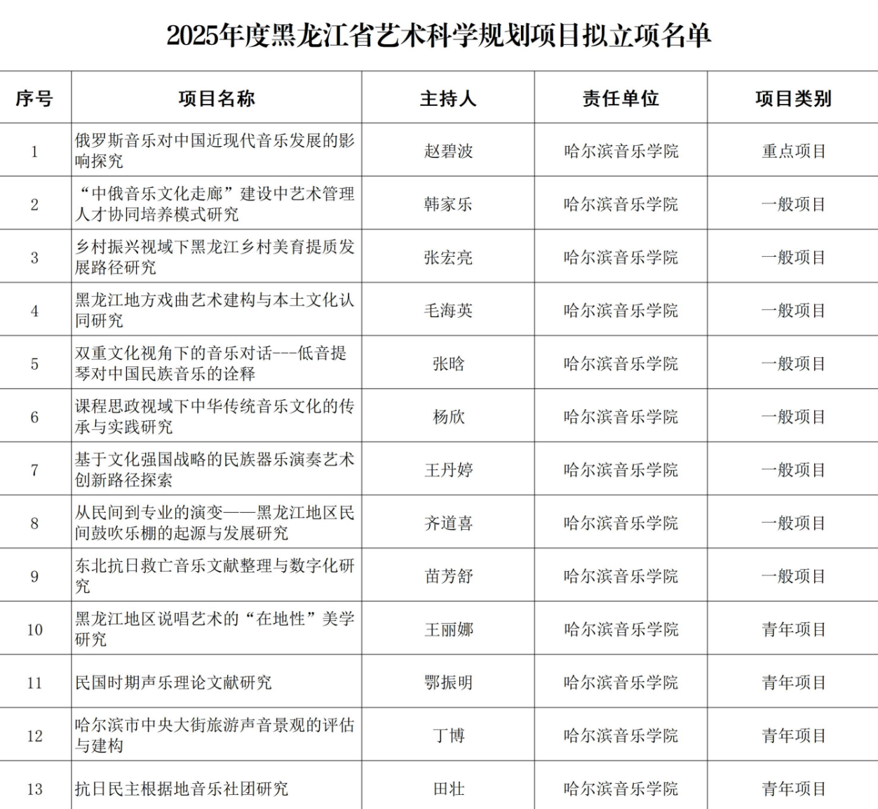 近日,黑龙江省艺术科学规划领导小组办公室公布了2025年度黑龙江省艺术科学规划项目立项名单。学院共获批立项13项,其中,重点项目1项,一般项目8项,青年项目4项,立项数量创近三年新高。