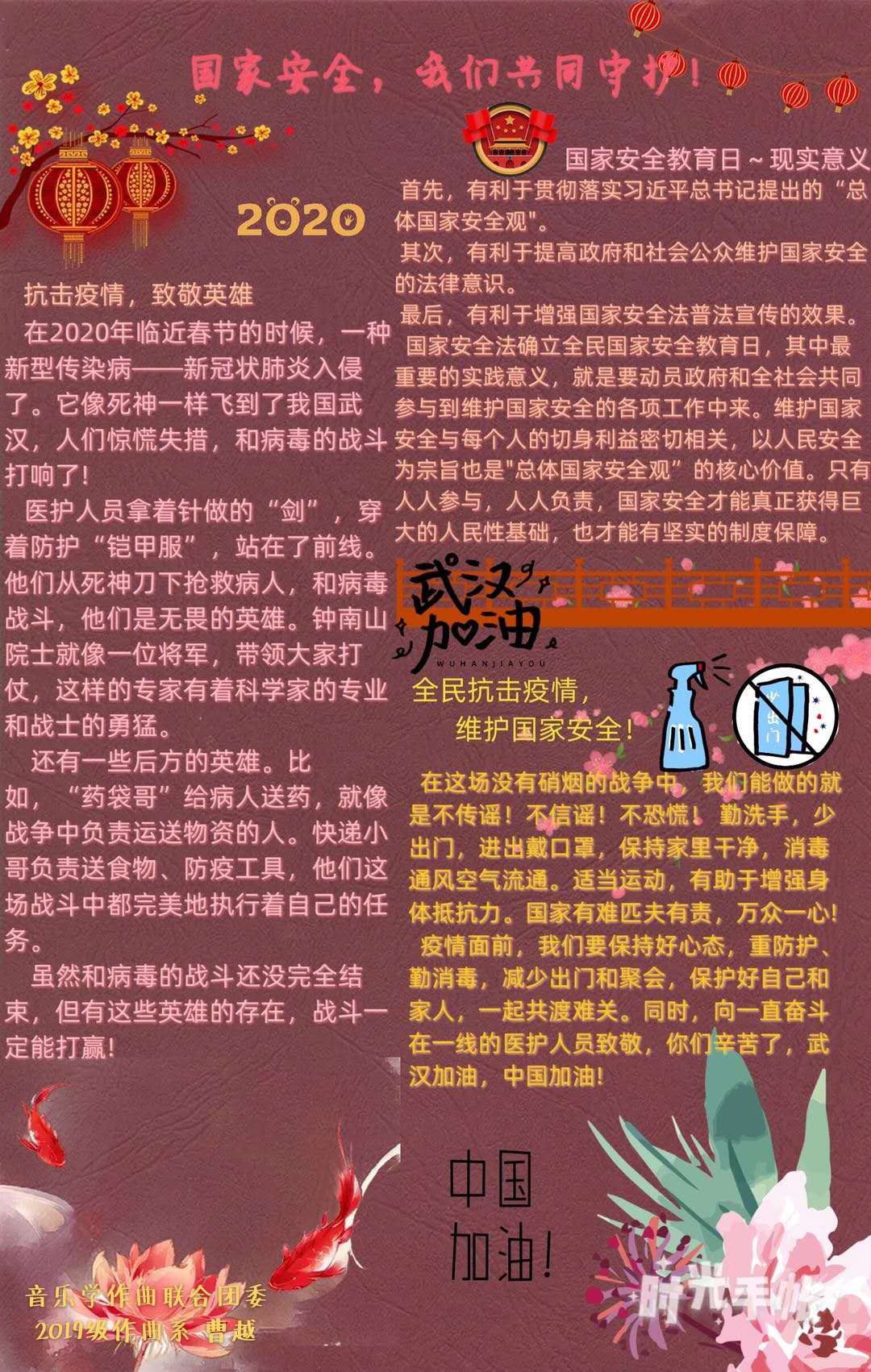 音乐学作曲联合党总支还号召学生们积极参加“国家安全在我心中”为主题的征文、手抄报活动,鼓励学生们用自己的方式表达对国家安全重要性的认识及坚决维护国家安全、校园安全的决心,用自己的行动带动身边人共同加入到维护国家安全的行动中来,努力争当“国家安全”的传播者、守护者。