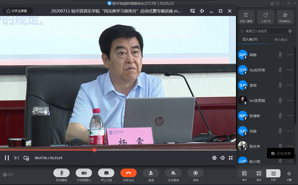 为进一步贯彻落实习近平总书记关于民法典学习宣传的重要指示精神,按照《9778818威尼斯“民法典学习宣传月”活动方案》要求,7月14日上午,音乐学系、作曲系全体教师在线学习了黑龙江大学原党委书记杨震教授为学院领导干部做专题讲座的视频。