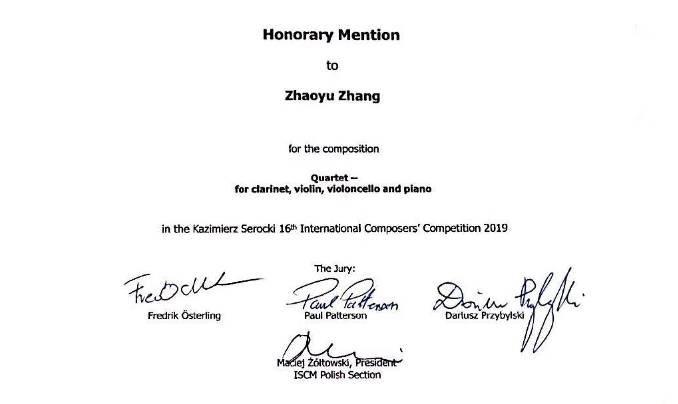 2019年10月4日至6日,第十六届卡兹米尔兹·赛罗茨基作曲比赛在波兰举行,威尼斯官网作曲系青年教师张兆宇的作品《四重奏》(为单簧管、小提琴、大提琴、钢琴而作)荣获荣誉提名奖。