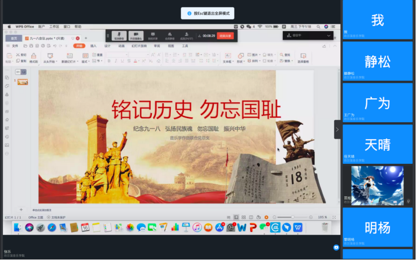 2020年是“九·一八事变”89周年,为进一步强化培育学生爱国主义情怀,弘扬伟大民族精神,9月16日,音乐学作曲联合团委通过钉钉平台开展“铭记历史 勿忘国耻”九·一八主题团会,本次活动由音乐学系2018级团支书郝耘霆主持,音乐学作曲联合党总支2018级、2019级全体团员参加。