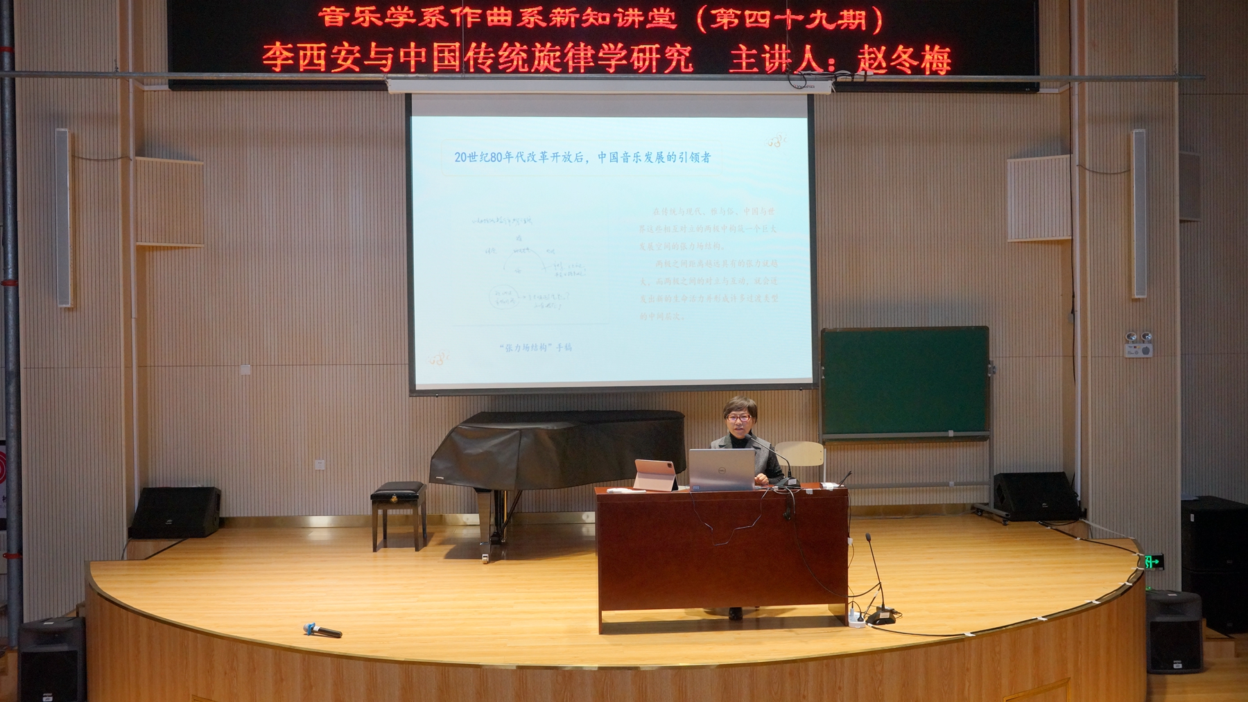 10月14日下午,音乐学系作曲系邀请中国音乐学院作曲系教授、博士生导师赵冬梅,中国音乐学院教授赵仲明做客第四十九期新知讲堂,分别以《李西安−−中国传统旋律学研究》和《我所认识的李西安先生》为题进行讲座。讲座由音乐学系副主任王岩主持,图书馆馆长顾伟泉介绍了李西安先生的捐赠情况,音乐学系和作曲系在校教师、博士研究生、硕士研究生近150人现场聆听。