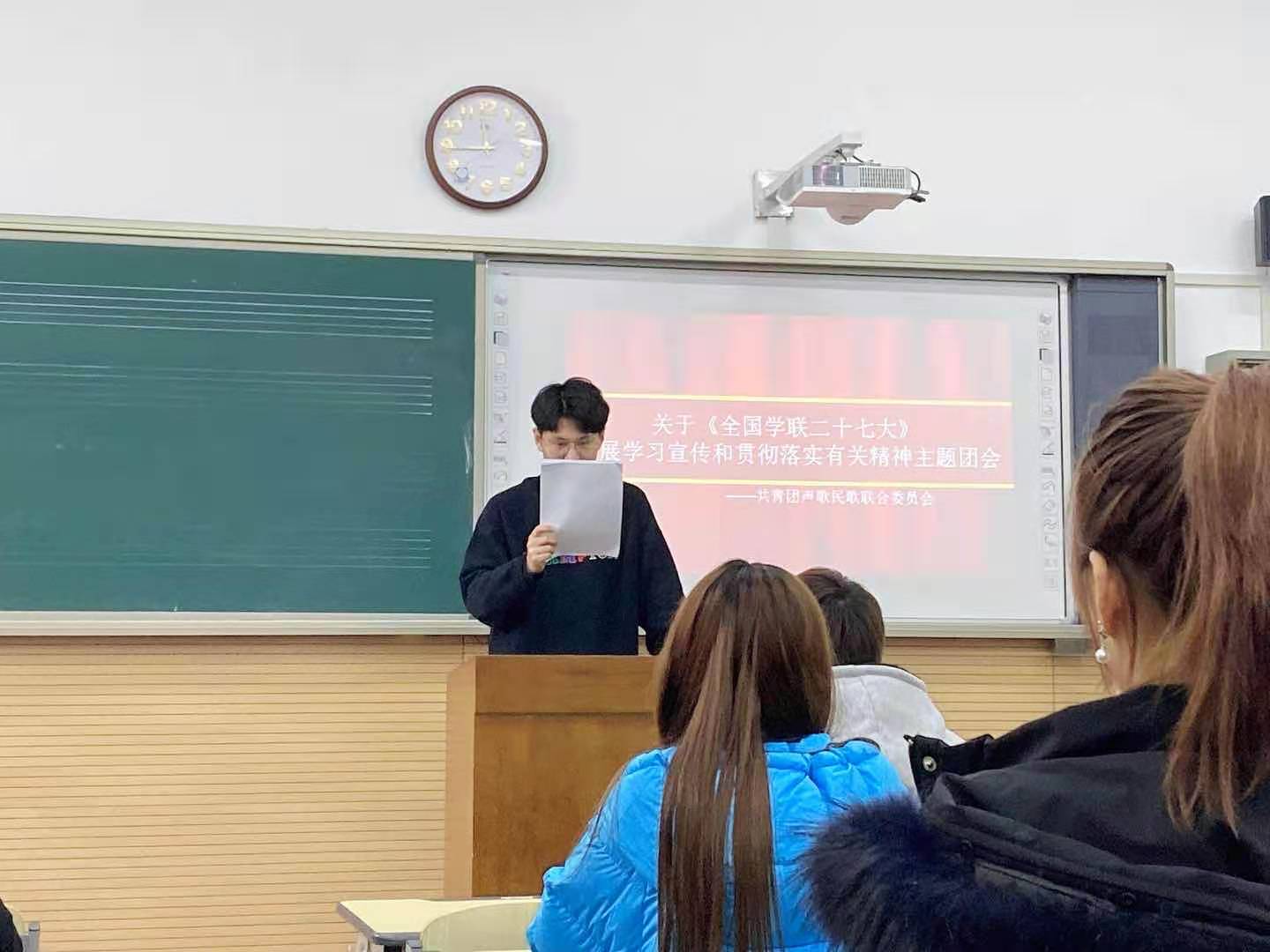 近日,共青团声歌民声联合委员会在主楼一楼教室按支部分别组织学生学习全国学联二十七次代表大会精神,直观感受了会议开幕式的盛况。