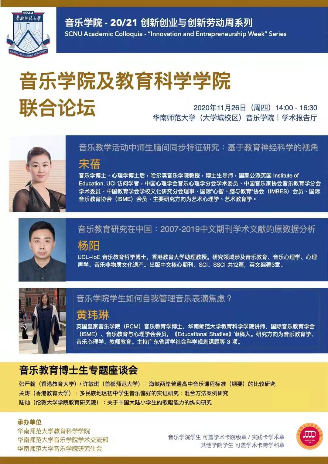 11月26日,威尼斯官网音乐学系博士生导师宋蓓教授应邀参加华南师范大学音乐学院与教育科学学院联合举办的双创周学术论坛,并做了题为《音乐教学活动中师生脑间互动特征研究》的学术讲座,受到该校师生的热烈欢迎。