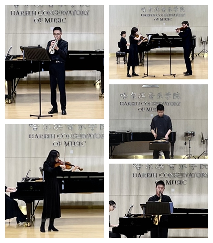 音乐会在管弦系教师李鑫执棒下的乐曲《我和我的祖国》中拉开帷幕,整首乐曲展示了伟大祖国蒸蒸日上的繁荣景象,营造了庄重恢弘的氛围,表现了中国人民的爱国情怀。由管弦系学生孙浩真表演的萨克斯独奏《圣母颂》、孙铭表演小号独奏海顿《降E大调协奏曲》,旋律悠扬、节奏舒缓,优雅的旋律使全场的气氛逐渐平静。由郑轶文、林靖禹两名同学带来的小提琴二重奏《肖斯塔科维奇小提琴二重奏组曲》,弓与弦的交错,节奏与旋律的交织,充分展示了二十世纪音乐的特点。张露尹、王铭瑞两名同学表演的《D大调中提琴协奏曲》《Meditation No.1》,悠扬的中提琴加上打击乐欢快的节奏,将现场气氛调动了起来。最后,铜管五重奏与打击乐的结合《中国军魂》将本场音乐会推向了高潮,该曲用激昂慷慨的音调和错落有致的节奏,表达了对祖国的挚爱之情,音乐会在热烈的气氛中落下帷幕。