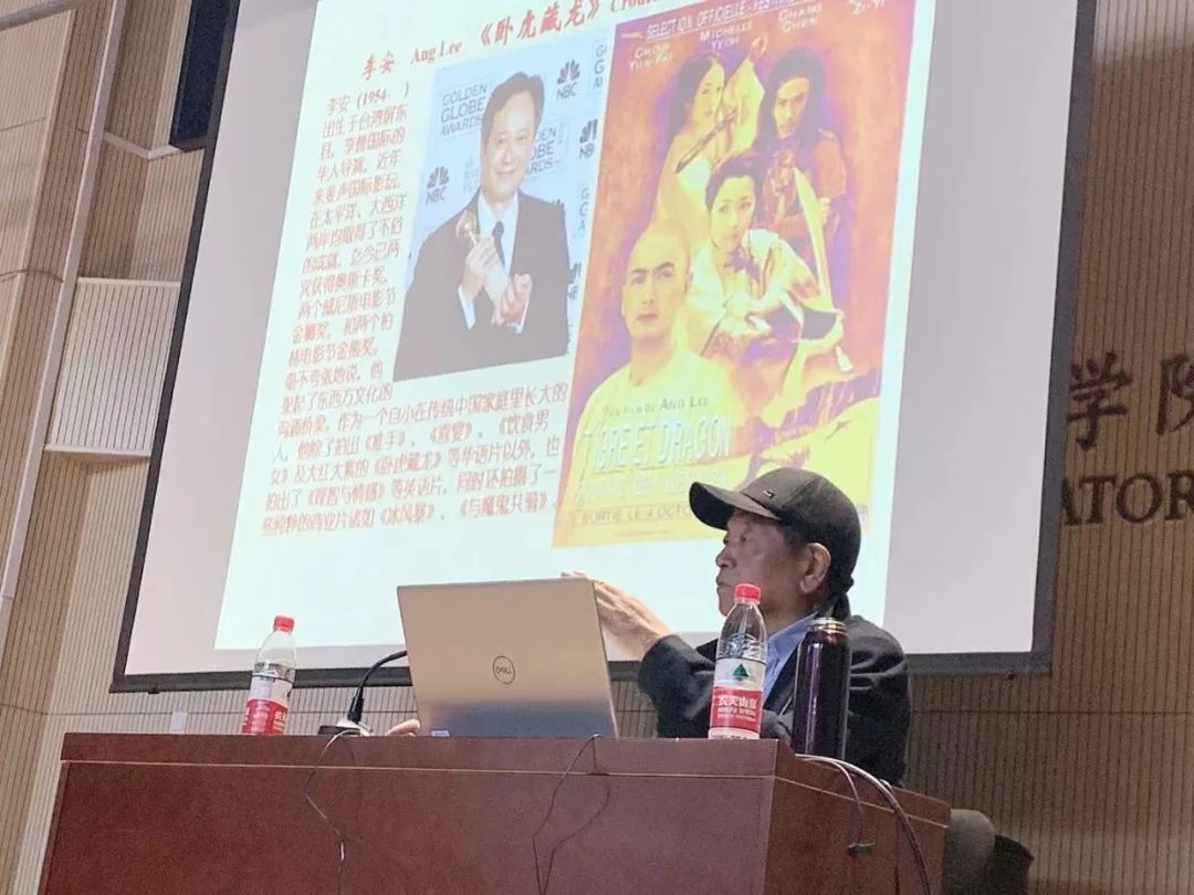 讲座中,他向与会师生介绍了不同门类中优秀的艺术家及最具代表性的现代风格艺术作品。他讲到,在音乐艺术领域中,旅美音乐家谭盾在香港回归祖国的音乐晚会上,将古代乐器编钟与现代音乐语汇结合起来,在他为《卧虎藏龙》所创作的音乐中,更是将中国乐器锣、鼓、钹、板巧妙编制为乐曲;在建筑艺术领域中,建筑大师贝聿铭善于运用现代建筑艺术语言来体现东方文化意识和审美特征,他设计的北京香山饭店就是一个典型作品。