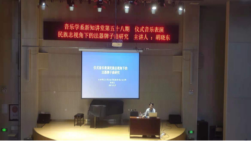 5月27日下午,音乐学系邀请江西师范大学音乐学院教授、博士生导师胡晓东教授做客第五十八期新知讲堂。胡晓东以《仪式音乐表演:民族志视角下的法器牌子曲研究》为题,在主楼A220演奏厅做了主题讲座。本次讲座由民族音乐学教研室主任李然教授主持,音乐学系全体师生聆听了讲座。
