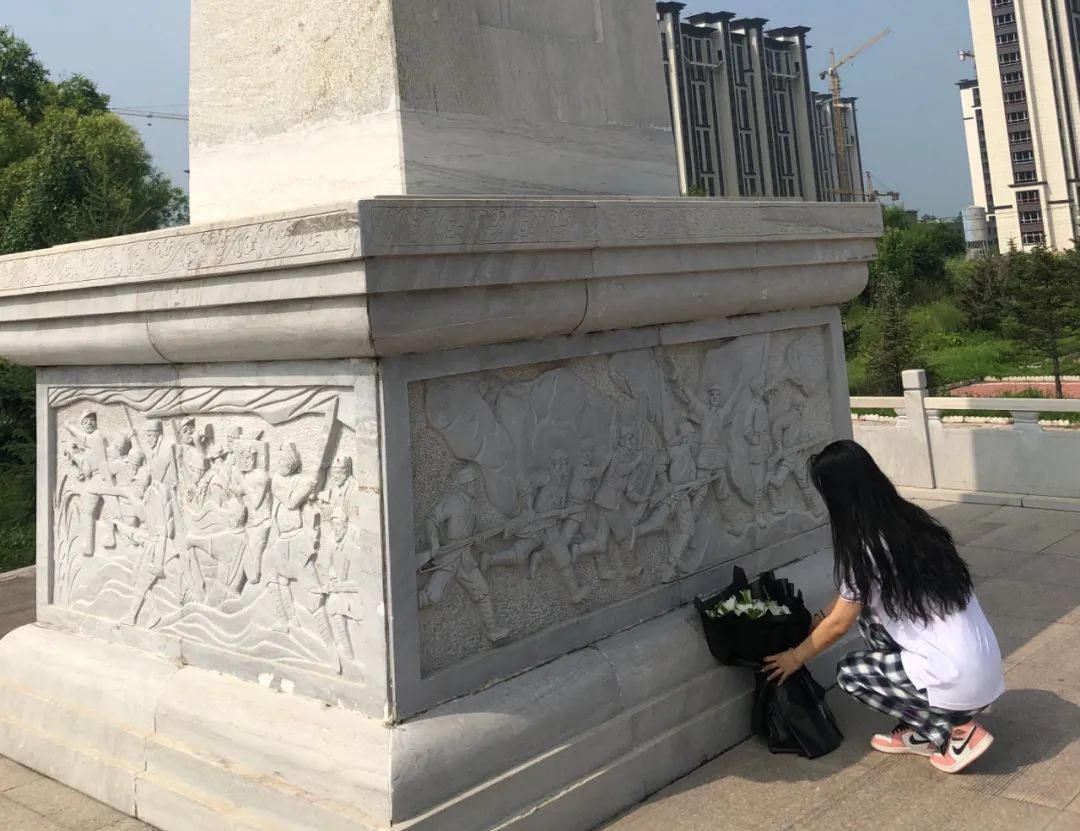 在纪念碑前,学生代表向革命烈士纪念碑敬献鲜花并默哀。