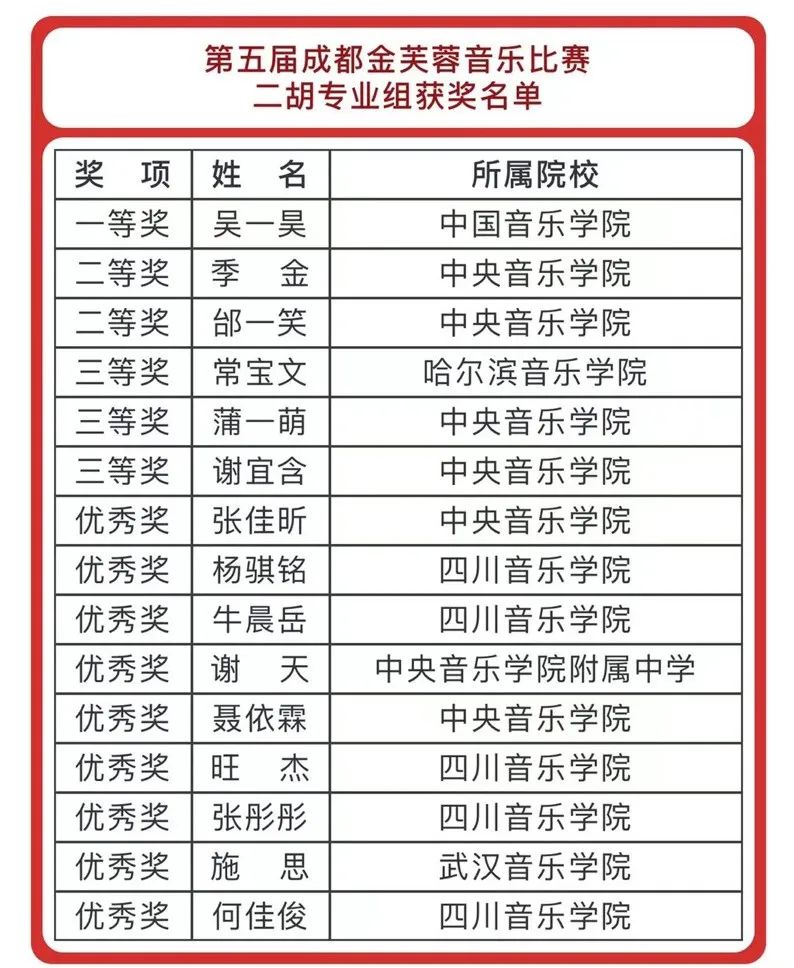 第五届成都“金芙蓉”音乐比赛分为器乐(二胡、古典吉他),声乐(美声、民族唱法),青少年展演组(声乐、古典吉他、二胡)三大类四个专业进行。