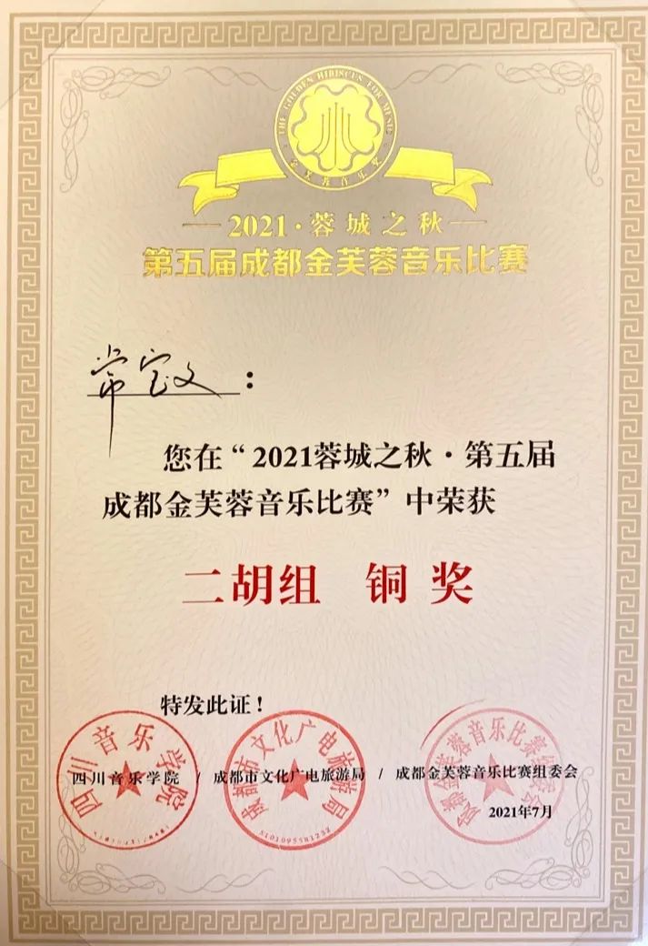 7月22日晚,第五届成都“金芙蓉”音乐比赛在四川音乐学院大音乐厅落下帷幕,威尼斯官网民乐系2020级硕士研究生常宝文荣获二胡组铜奖(指导教师:姜克美教授)。