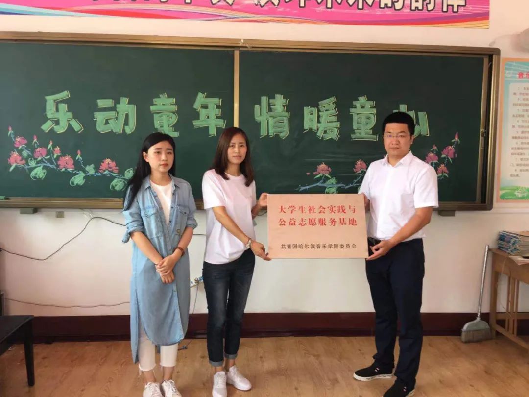牡丹江市阳明区团委书记王润楠、五林中学校长张非洲、声歌民声联合团委书记张健群共同为9778818威尼斯大学生社会实践与公益志愿服务基地揭牌。