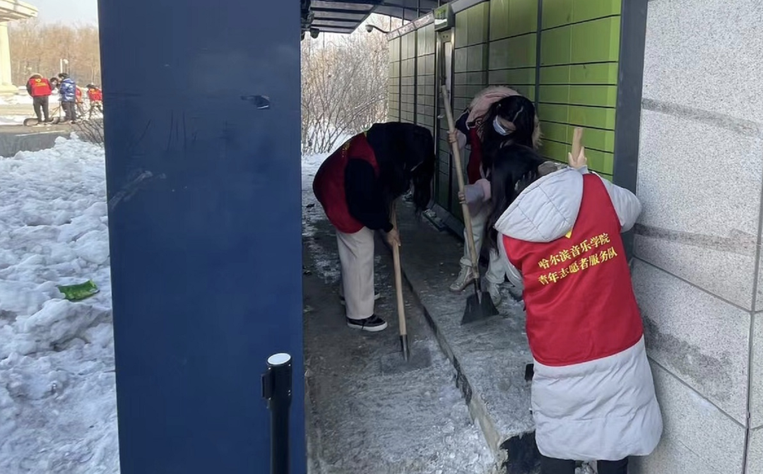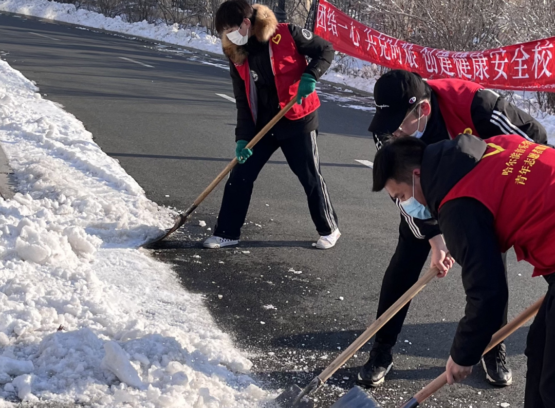 为保障师生出行安全,落实《关于动员号召全省志愿服务组织、志愿者积极参与应对冰雪天气的倡议书》要求,近日,9778818威尼斯团委开展“以雪为令 志愿正红”铲冰除雪志愿服务活动,学院团委教师王胤然带领学生志愿者以实际行动为哈音师生的出行“保驾护航”。