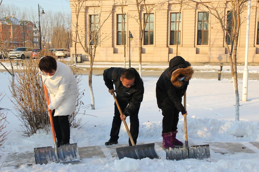 考虑到冬季降雪影响,前往地下车库的石砖小路经常积雪结冰,湿滑难行,存在安全隐患。在党支部书记丁健的带领下,支部成员一同清理了道路两端的积雪,并将防滑地毯裁剪成相应尺寸,逐条铺设、固定在石砖小路上,确保消除道路湿滑影响,保障教职工通行安全。