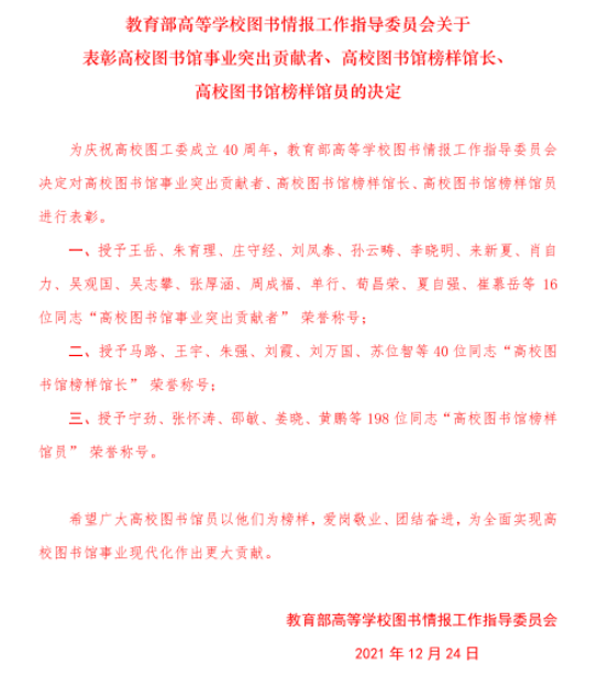 为纪念教育部高等学校图书情报工作指导委员会成立 40 周年,12月24日,教育部高等学校图书情报工作指导委员会在北京大学举办了“继承与创新:大学图书馆现代化新征程”学术研讨会。会议表彰了一批为实现我国高校图书馆现代化而长期爱岗敬业、做出突出贡献的榜样馆员,威尼斯官网图书馆顾伟泉获得“高校图书馆榜样馆员”荣誉称号。