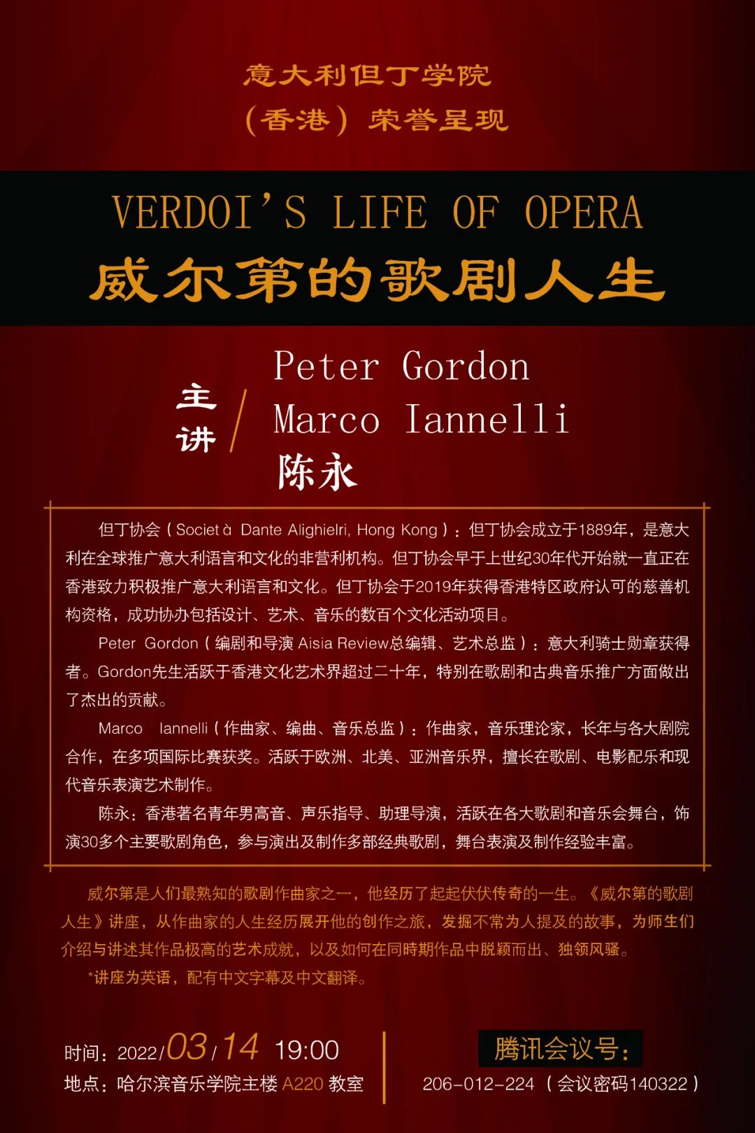 3月14日晚,声乐歌剧系与意大利但丁协会联合举办“威尔第的歌剧人生”专题讲座,讲座由但丁协会驻香港办事处的著名编剧、导演、艺术总监、意大利骑士勋章获得者Peter Gordan先生,著名作曲家、音乐理论家Marco Iannelli先生和香港著名男高音、声乐指导、助理导演陈永先生联合主讲,讲座全程在英语的语境下进行,陈永先生同时担任翻译。声乐歌剧系师生通过线上线下相结合的方式聆听讲座,讲座由声乐歌剧系主任刘嵩虎主持。