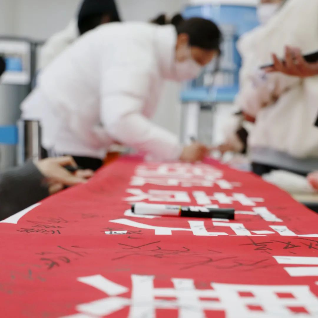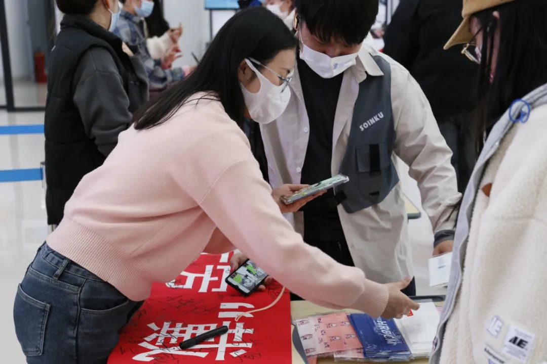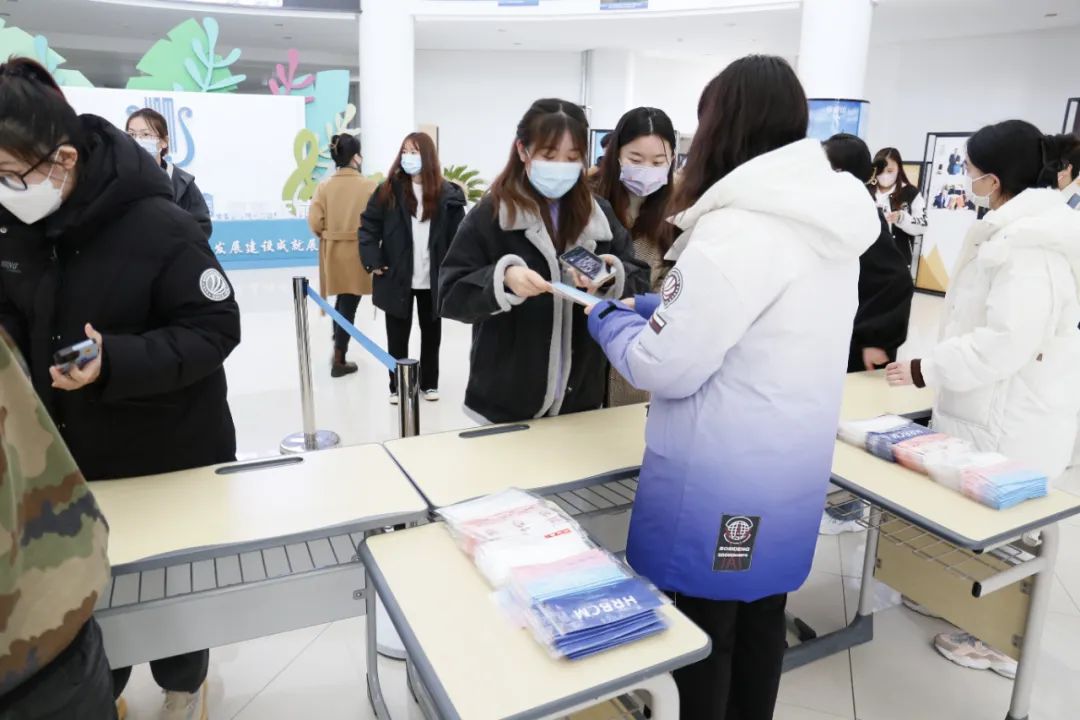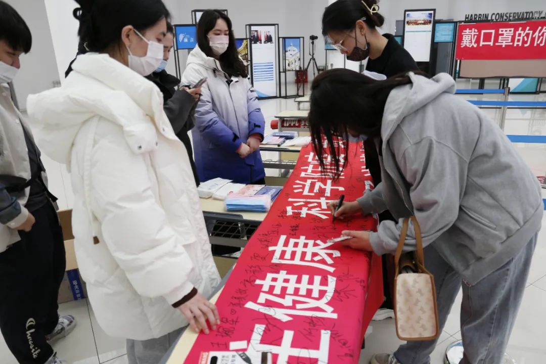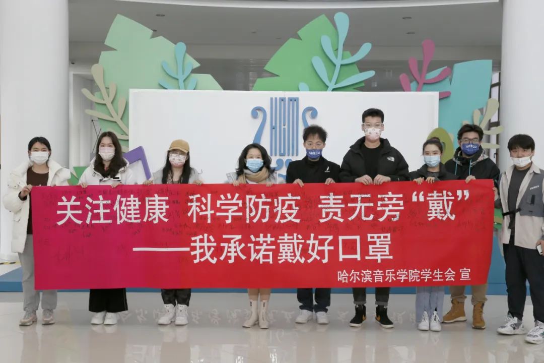 在主楼一楼大厅,来自学院各专业的400余名同学依次排队领取哈音文创系列口罩,按疫情防控要求,活动共开设5条领取通道,学生按照错峰时间前往指定地点,确保学生不聚集、不扎堆。领取口罩后,学生们纷纷自觉地在倡议条幅上签名,用这种方式表达自己积极主动配合学院的疫情防控工作。