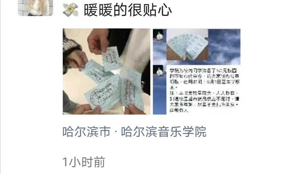 同学们纷纷表示:“学院的举措真的是太暖心了!学院真给我们‘发钱了’!感谢学院的领导和老师们,你们和我们一块住校,真的辛苦了!”同学们领完“暖心券”立即晒出朋友圈,表达喜悦心情,并表示哈音就是你们眼中的“别人家的大学”。部分学生家长获悉后也深受感动:“暖心券是学院送给孩子的温暖和关爱,感谢哈音,为哈音点赞。”