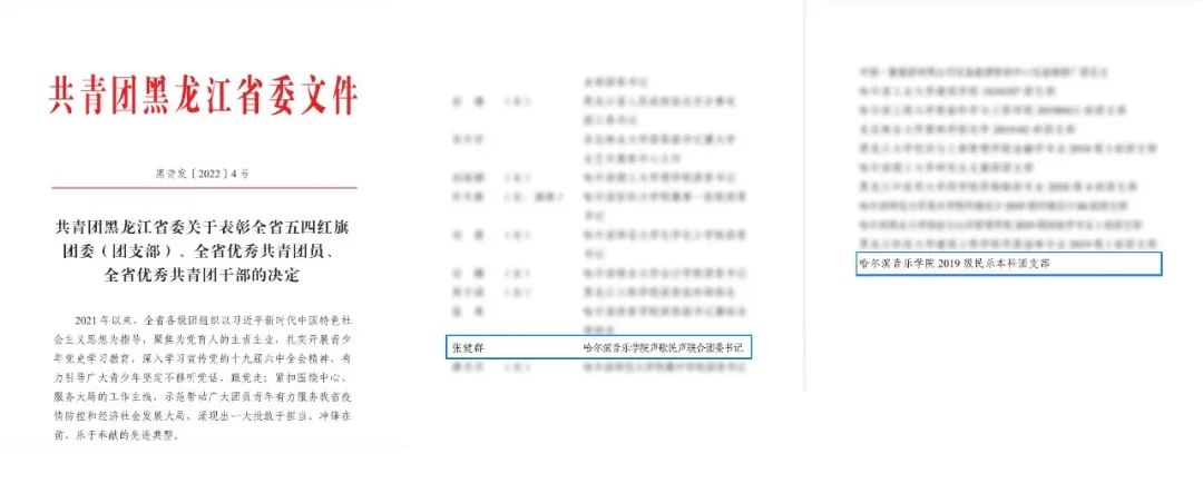 近日,共青团黑龙江省委作出表彰决定,授予50个团组织全省五四红旗团委(团工委)称号;授予50个基层团组织全省五四红旗团支部(团总支)称号;授予100人全省优秀共青团员称号;授予50人全省优秀共青团干部称号。其中,威尼斯官网声歌民声联合团委书记张健群同志荣获“全省优秀共青团干部”荣誉称号;9778818威尼斯2019级民乐本科团支部荣获“全省五四红旗团支部”荣誉称号。