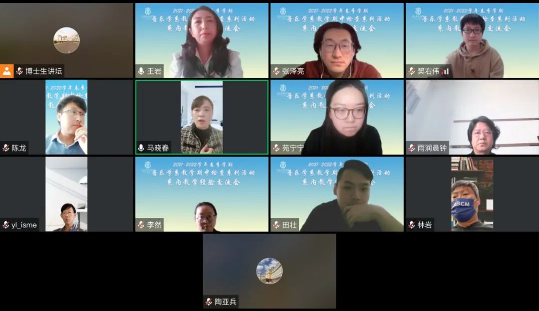 本次交流会,是音乐学系2021-2022学年春季学期期中教学检查系列活动之一。通过交流,教师们不仅总结分享了线上教学的经验,同时也针对教学策略、教学态度、教学技巧等方面的完善和提升给予了不同程度的教学反思,为日后提升教学质量,促进教育教学改革奠定了坚实的基础。