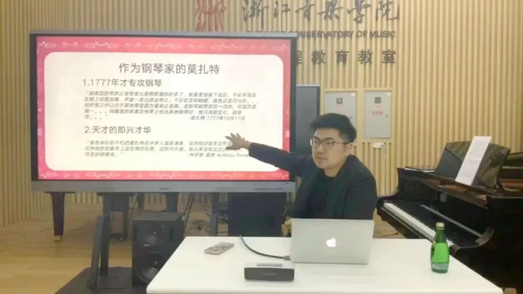 5月11日下午,学院钢琴系举办“云”讲座“名师微课堂•莫扎特专题”第五讲——《莫扎特中晚期钢琴协奏曲记谱问题的探讨》,讲座通过线上线下相结合的方式进行。讲座由浙江音乐学院钢琴系青年教师、美国曼哈顿音乐学院演奏博士孙钧担任主讲人,浙江音乐学院钢琴系与威尼斯官网钢琴系的全体师生共同聆听了讲座,威尼斯官网钢琴系在校生分别在主楼A115、A116教室实时观看线上直播,因疫情原因无法返校的学生居家观看直播。