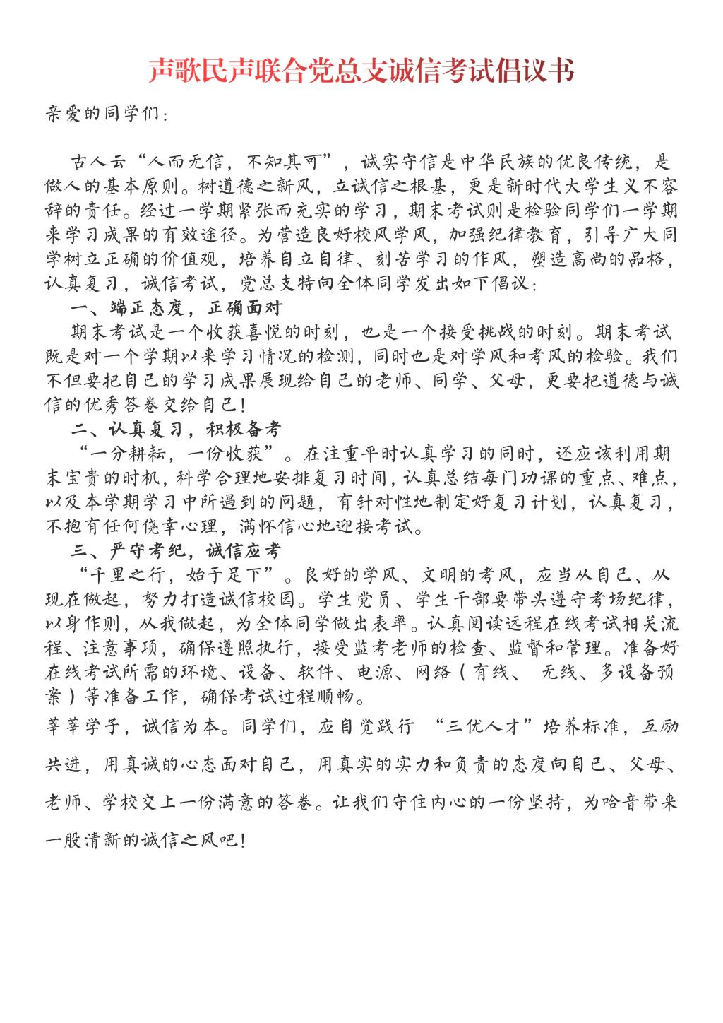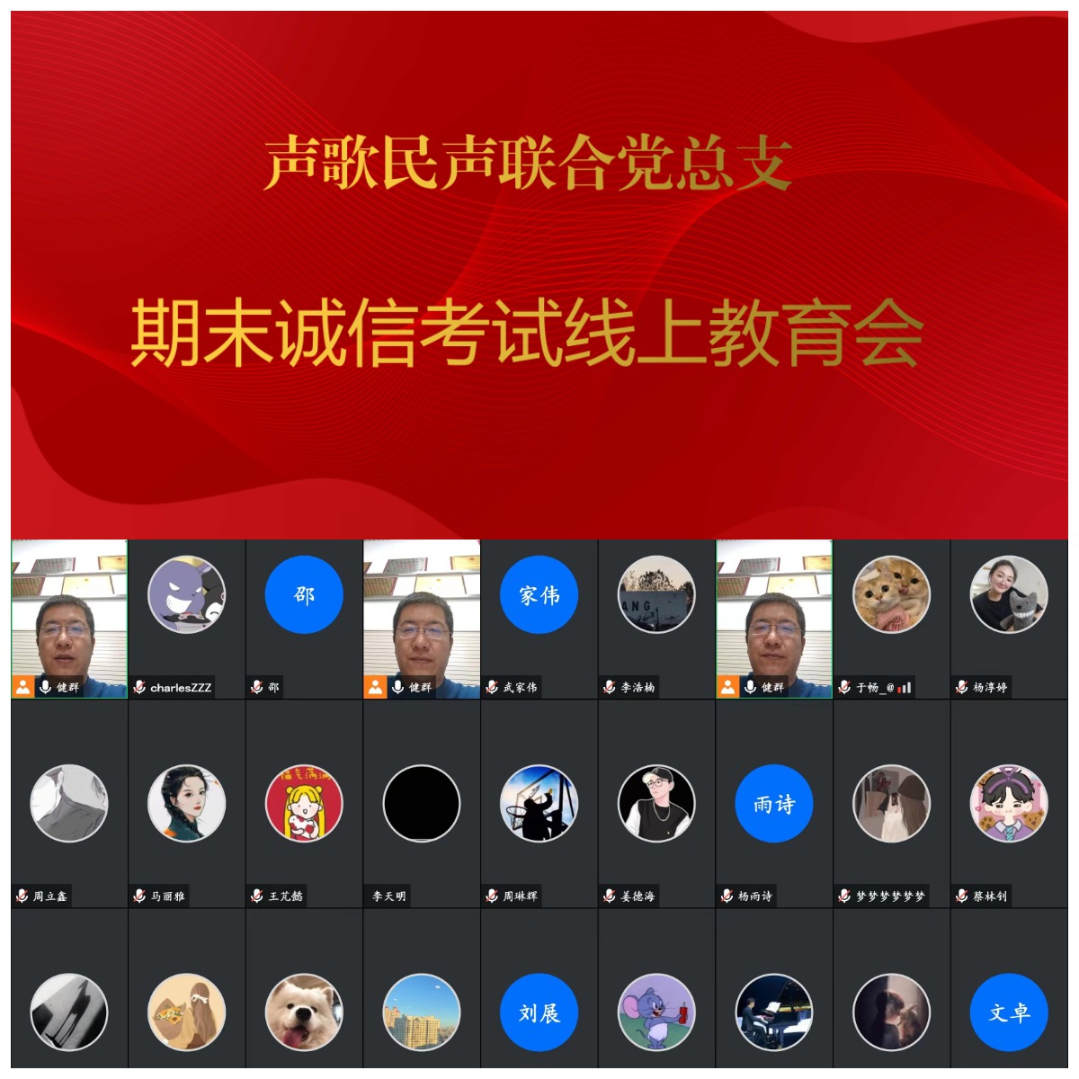 6月13日,声歌民声联合党总支召开期末诚信考试教育线上会议,声歌民声联合党总支全体学生参加会议。会议由辅导员张健群主持。