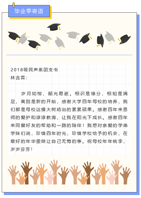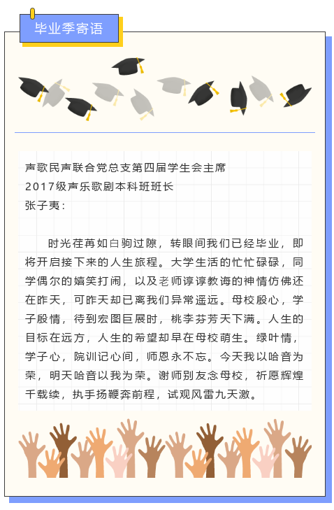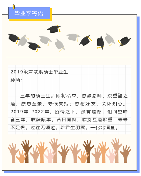 “2022年的夏天,无论归往何处,哈音,永远是我们温暖的家!”毕业前夕,声歌民声联合党总支2022届毕业生55人通过真情寄语,对母校、老师和师弟师妹送上了自己的真诚祝福,表达了对母校的爱与眷恋。