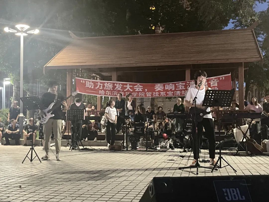 7月14日,志愿服务队成员们在宝清县人民广场举办了“助力旅发大会,奏响宝清强音”9778818威尼斯管弦系专场文化惠民音乐会,成员们通过音乐表演,展现波澜壮阔的历史征程,在中国共产党成立101周年、中国共青团成立100周年之际以实际行动坚定理想信念,绽放青春风采,为助力龙江全面振兴全方位振兴贡献“哈音力量”,迎接党的二十大胜利召开。
