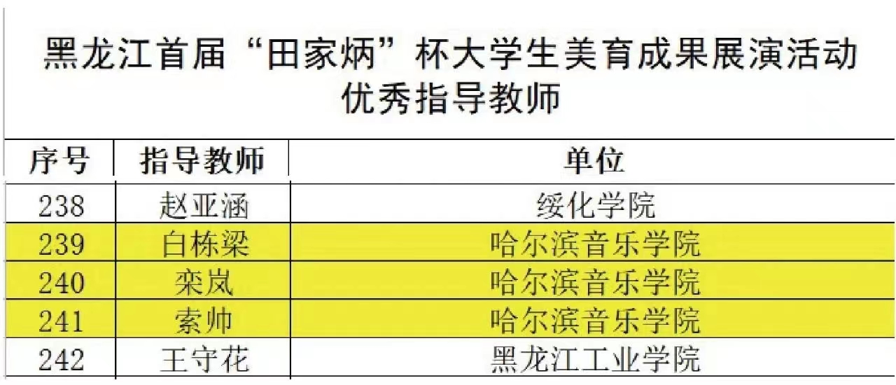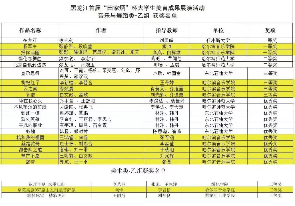 近日,黑龙江省首届“田家炳”杯大学生美育成果展演活动评审工作全部结束。学院选送的19部音乐与舞蹈类与3部美术作品,共荣获2个一等奖、4个三等奖和5个优秀奖;索帅、栾岚、白栋梁3位教师被授予“优秀指导教师”荣誉称号;学院作为音乐与舞蹈类专业组获奖最多的单位,荣获“优秀组织奖”。