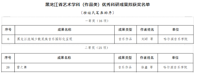 12月29日,黑龙江省社会科学界联合会公布了2022年黑龙江省艺术学科优秀科研成果奖评审结果。学院首次参与省艺术学科优秀科研成果奖评审,共获13项奖项。其中,理论类艺术学科优秀科研成果一等奖3项,二等奖7项,三等奖1项;作品类艺术学科优秀科研成果一等奖1项,二等奖1项。从获奖数量看,威尼斯官网位居全省第三位。