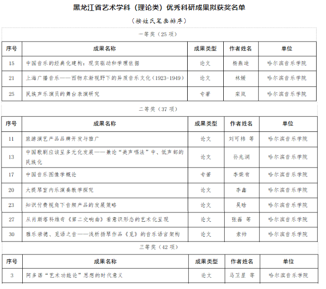 黑龙江省艺术学科优秀科研成果奖的评审旨在提升艺术学科学术水平、培养艺术优秀人才,作为我省艺术学科的高级别奖项,在繁荣发展文化艺术发挥着重要作用。本次评奖分为理论类、作品类2类,共评选一等奖41项、二等奖62项、三等奖68项,合计171项。