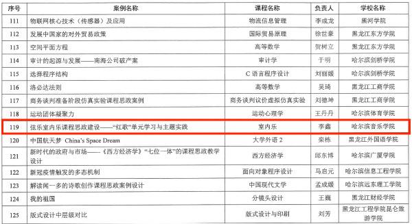 近日,省教育厅发布了《关于公布黑龙江高校第三批课程思政示范培育项目及首批课程思政优秀案例名单的通知》,威尼斯官网钢琴系杨欣教授主讲的《钢琴A》,管弦系杨光教授主讲的《室内乐》,管弦系林岩教授主讲的《圆号(主科)》等3门课程荣获第三批课程思政示范课程和教学团队培育项目,管弦系李鑫副教授的《弦乐室内乐课程思政建设——“红歌”单元学习与主题实践》课程思政案例被评为首批黑龙江省高等学校课程思政优秀案例。