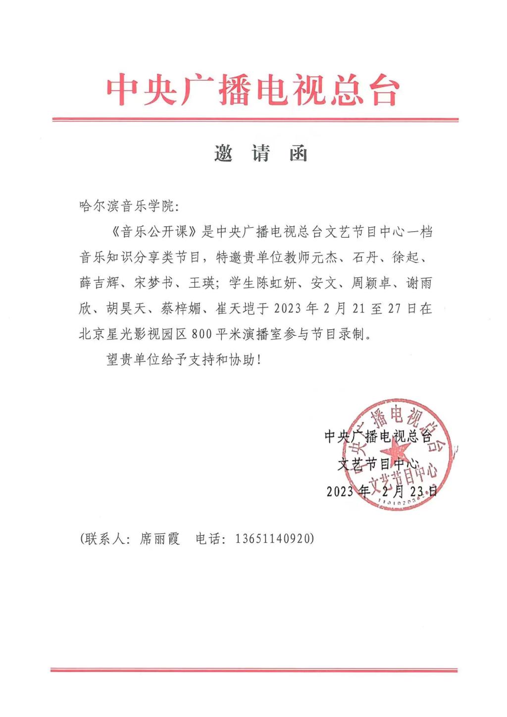 应中央广播电视总台文艺节目中心邀请,2月25日,由学院钢琴系主任元杰带队,教师宋梦书、石丹、徐起、王瑛、薛吉辉及学生代表共13人,赴北京中央电视台录制CCTV15频道节目《音乐公开课》。