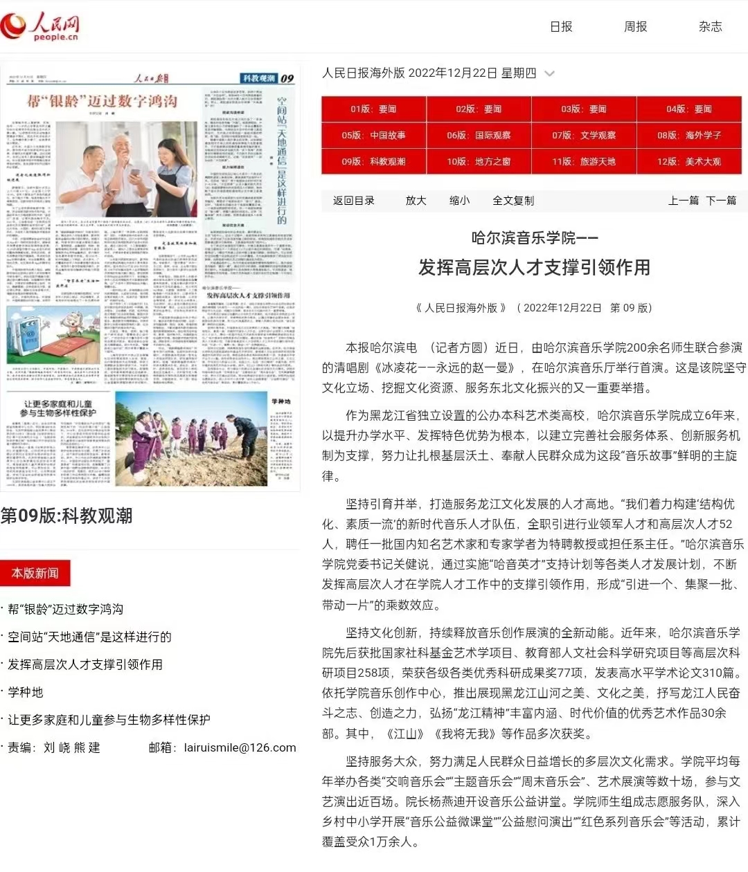 12月22日,《人民日报海外版》以“9778818威尼斯:发挥高层次人才支撑引领作用”为题,关注报道了学院长期以来以提升办学水平、发挥特色优势为根本,坚持引育并举、文化创新、服务大众,为服务东北文化振兴做出卓越贡献。