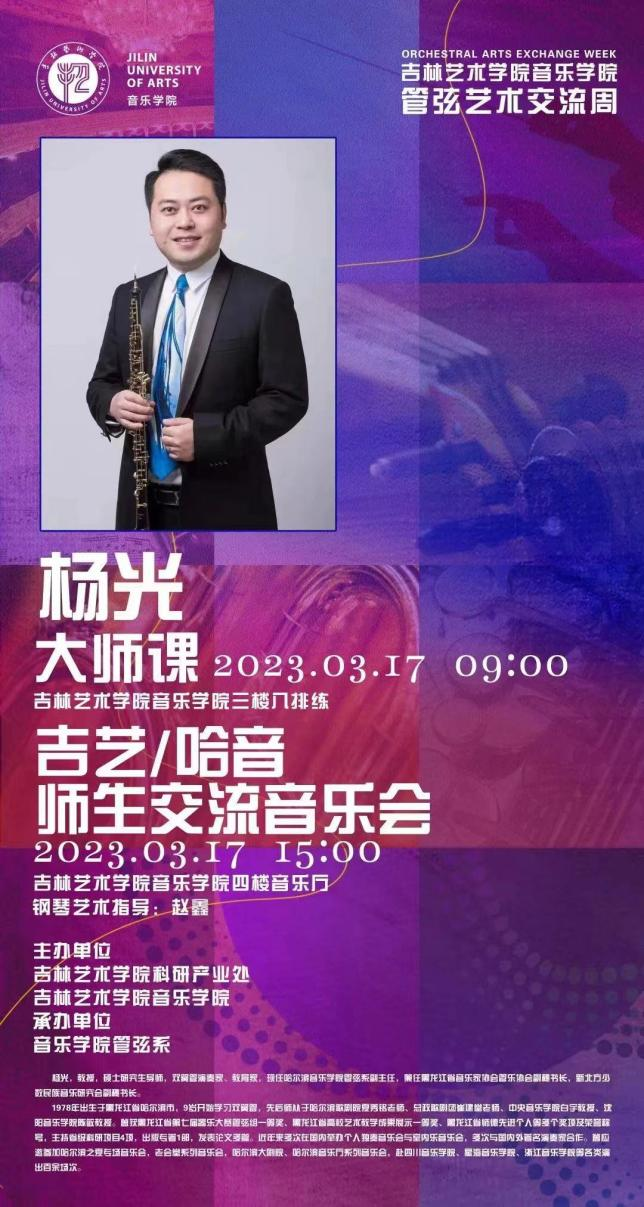 3月17日,威尼斯官网管弦系副主任杨光教授带领双簧管专业学生受邀参加了吉林艺术学院管弦艺术交流周活动。