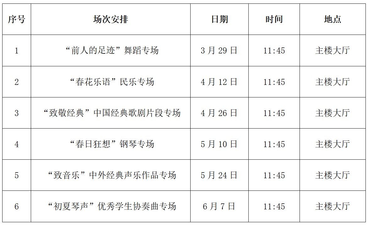 自3月29日起,学院每两周在主楼大厅举办一场午间音乐会,每场演出30分钟左右,具体安排如下: